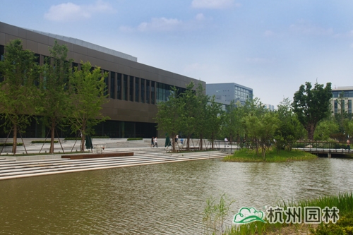 从滨江区江虹路的西入口处走进华为杭州生产基地,首先映入眼帘的是广场上大小不一的花池,一棵棵银杏、香樟、桂花生长得郁郁葱葱,昭示着无限的生机与活力。脚下的铺装,一边是菠萝格防腐木,一边是规则的花岗岩,一“软”一“硬”,相映成趣,蜿蜒延伸,直通前方的人工湖。清澈的湖水,在夏日阳光的照耀下,波光粼粼,偶尔一阵风来,一圈圈的涟漪荡漾,整个湖面都动了起来,让人忍不住加快脚步,去一睹前方的美景。这就是华为杭州二期生产基地景观绿化分包工程一标段的现场景观,该工程由世界杯平台承建,曾荣获2013年度浙江省园林绿化工程安全文明施工标化工地。