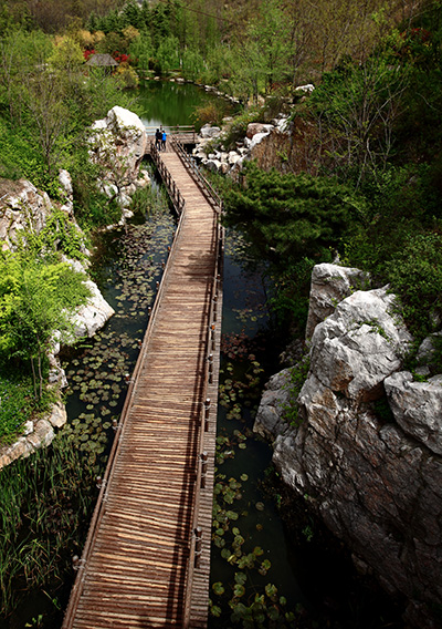 四大静园位于北坡,分别名为彩径观花园、石林听涛园、秀谷韵乐园和唱竹揽翠园,四个园子主题明确,景深丰富,个性分明,匠心独具,一草一木别有风韵。其中,石林听涛园位于公园西南侧,是一座秀美的古典园林,具有浓郁的江南水乡特色,由红梅、南天竹、腊梅等植物组成的漂亮花境,给人带来赏心悦目之感;蜿蜒曲折的木栈道则连接起了园内的汀步和园路,带领游人去欣赏园内的每一处美景。唱竹揽翠园位于公园中部,全园格局显得紧凑自然,丰富的植物应用,使得园内一年四季景色各异,特别是刚竹、紫竹、凤尾竹、湘妃竹、慈孝竹等竹子的应用,更是呼应园名,行走在园内,伴随着阵阵清风徐来,让人仿佛置身于“竹海听涛”的悠闲意境中。