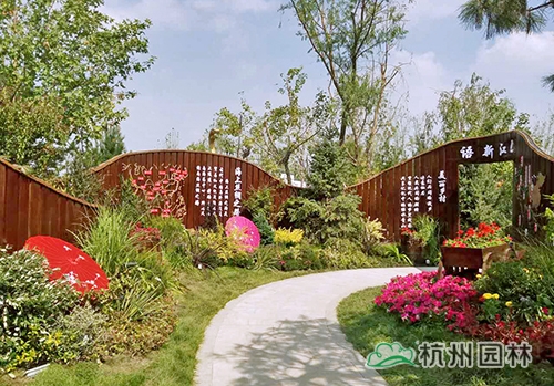 考虑到银川的干燥气候,垂直绿化墙植物的保湿成为难题。“浙江园”垂直绿化墙以无纺布为墙体材料,使用保湿性强的基质,优选植物种类,同时搭配滴灌系统,保证了绿化墙鲜花拥簇的景象。展园内的垂直绿化墙设计简洁、曲线优美,与以钱塘江文化为主题的背景墙相互映衬,共同展现了新时期浙江园林景观的不断发展与创新。