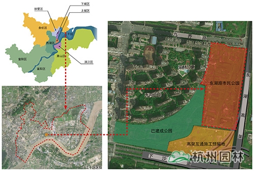 江干区东湖路市民公园位于东湖路与九乔街西南角,毗邻九月庭院和泊林印象小区,是江干区“一带生态功能区”的“运河—钱塘江—东湖路”U型生态轴的重要节点。结合已建成公园和高架互通施工预留地,对东湖路市民公园进行统一规划。
