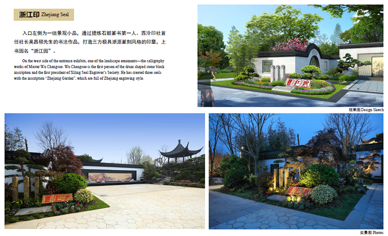 位于浙江园主入口西侧的景观小品“浙江印”,提炼自石鼓篆书第一人、西泠印社首任社长吴昌硕先生的书法作品,三方极具浙派篆刻风格的印章上,“浙江园”三个字,干净、利落,古朴、大气。这幅美景的背后,是深化设计团队数次往返西泠印社,从无数的篆刻名家作品中挑选、比对,决定采用最能代表浙江篆刻艺术的吴昌硕先生字体,从中找出“浙”、“江”、“园”三个字,在设计图中反复比对,调整位置、大小,最终确定下来。
