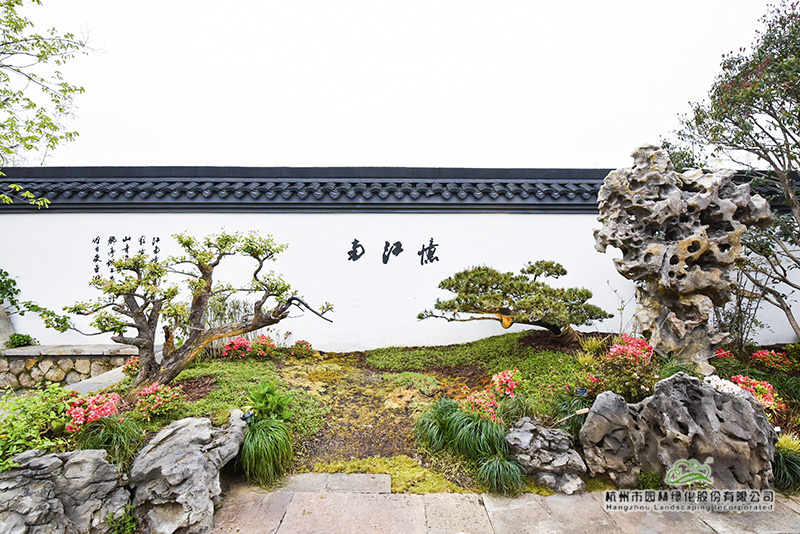再往里走,富春山居照壁前的造型黑松和红花檵木,一左一右,遥相呼应,树姿优美,枝干舒展,仿佛热情欢迎远道而来的客人。这两棵树,是深化设计团队跑遍全国重要苗圃挑选回来的,让最美的一面呈现在游客面前。
