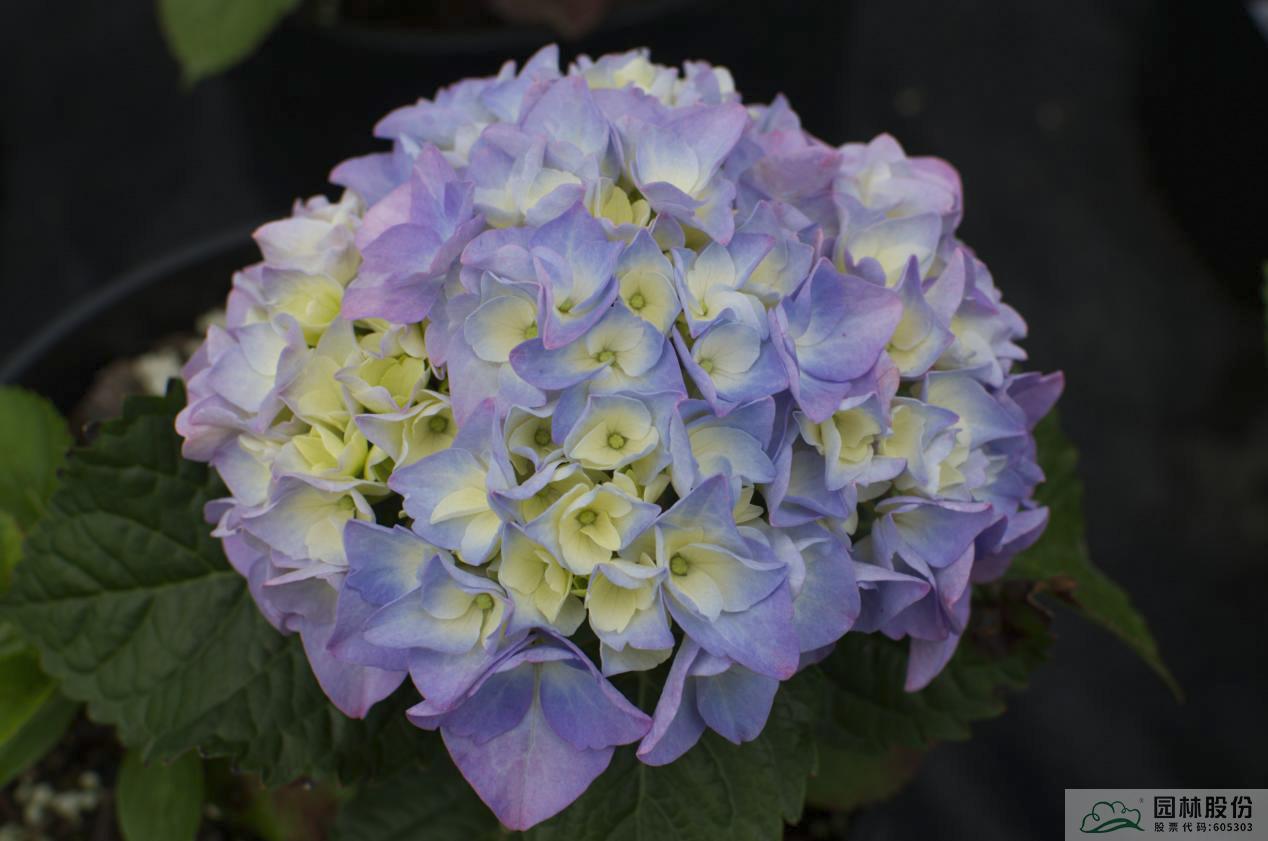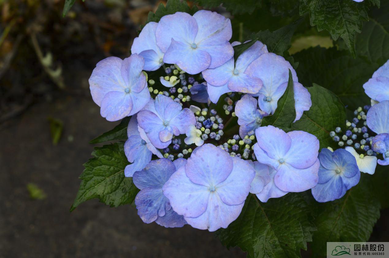 大叶绣球品种间杂交品种;叶片卵形,中绿色;盘状花,萼片(花瓣)巨大,花色为深紫粉色至鲜紫蓝色,添加调蓝剂时可变为深紫蓝色。花开时,宛如一只只蝴蝶在枝头翩跹,灵动多姿。杭州5月上旬开花,可延续至6月下旬。