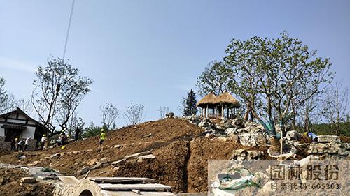自今年四月份开工以来,杭州园的各项工作进展有序。截止目前,主体建筑、水系跌瀑、溪流假山等基本完工,大部分铺装已经完成,展园景观风貌初见雏形。接下来主要进行乔木和大灌木的种植工作。正值夏季高温时节,为提高树木的成活率,施工中多措并举,提前将挑好的大树进行修剪、断根、喷洒营养液;采用通气透水的材料包裹土球,进行容器假植;制定精细浇水养护方案等,使植物清凉度夏,早日绽放风华。
