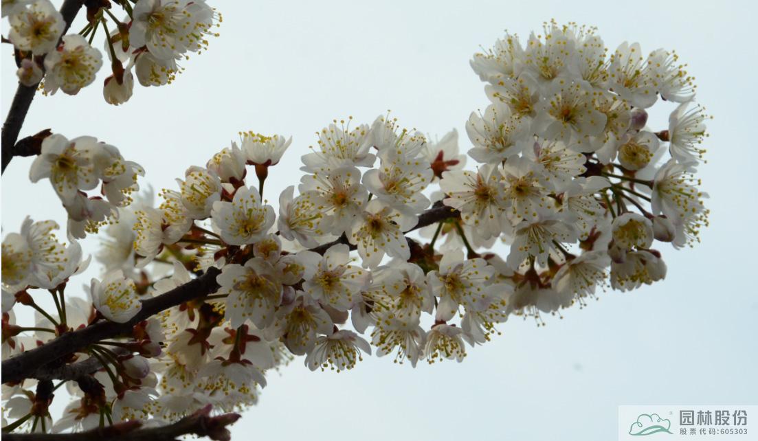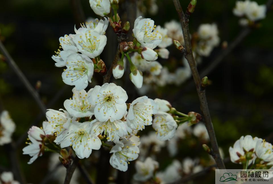 ‘螺蛳粉儿’为乔木,高约8m,树皮灰褐色;叶片卵状椭圆形;花浓香,伞形花序,有花4-6朵,稀3朵;总花梗绿色,长4~8mm;每20cm花枝花序数15~20个,花朵围绕枝条形成串串花束;花瓣白色,中等卵形,花冠浅杯状;雄蕊35~41枚,花丝白色,花柱与雄蕊齐平,长于花瓣;核果卵球形,红色;花期3月上中旬,果期4~5月。