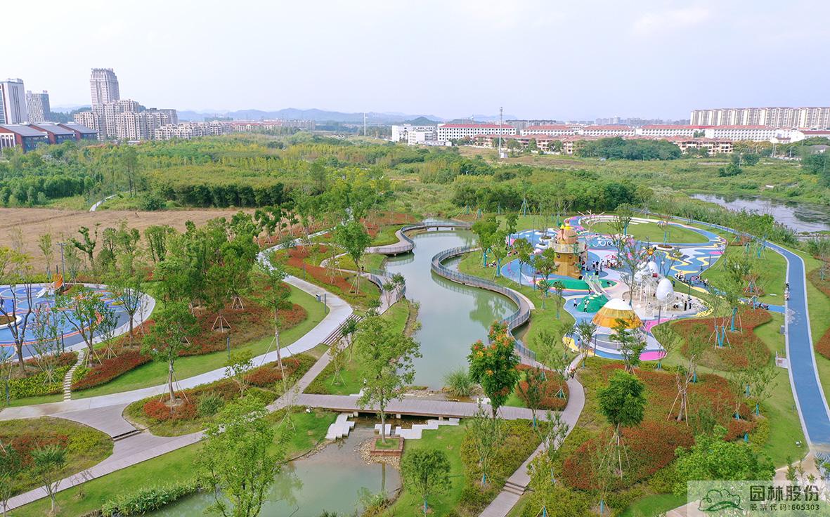 项目利用中心湖蜿蜒的湖湾和众多洼地,引水入园,形成沿湖而生的各个景点。湖区背山面水,视线开阔,能远望城市。沿线众多湖湾处,设置各色景观桥连通内塘与外湖的生态通道,同时景观建筑依水而建,与周边景色相映成趣。